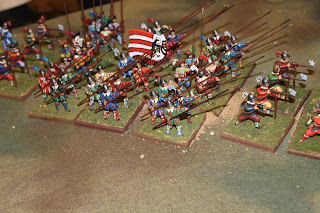 Friday night I played Ross MacFarlane's 16th century scenario using 40mm figures. Lovely figures and terrain. I played the British battling the French for possession of a town and supply lines. Victory was achieved by holding the town and getting two intact formations off the table on the far side. The French gained the initiative, grabbed the town and formed a cavalry blocking force to slow down pursuit. A cavalry battle ensued and the screening French brigade was broken. The English cavalry brigade that broke them headed for the table exit. The French pushed ahead with a giant pike unit. The English countered with their own pike unit. a push of pike ensued resulting in the resulting in the French pike falling back broken but the English pike were also all but spent. While this was going on, the English sent in their light troops to try and retake the town. This resulted in a see saw battle and the English were repulsed. The French occupation force was later broken. with the screening forces exhausted, it became a race to get units off the table. The two forces met at the road and fought for position to escape with depleted forces. In the end the English withdrew first claiming a narrow victory. Fun game and simple rules. We were 3 players a side and as the battle wore on we also started to wear down and discussion became heated at times but overall I enjoyed me co players and the GMs kept the game moving.